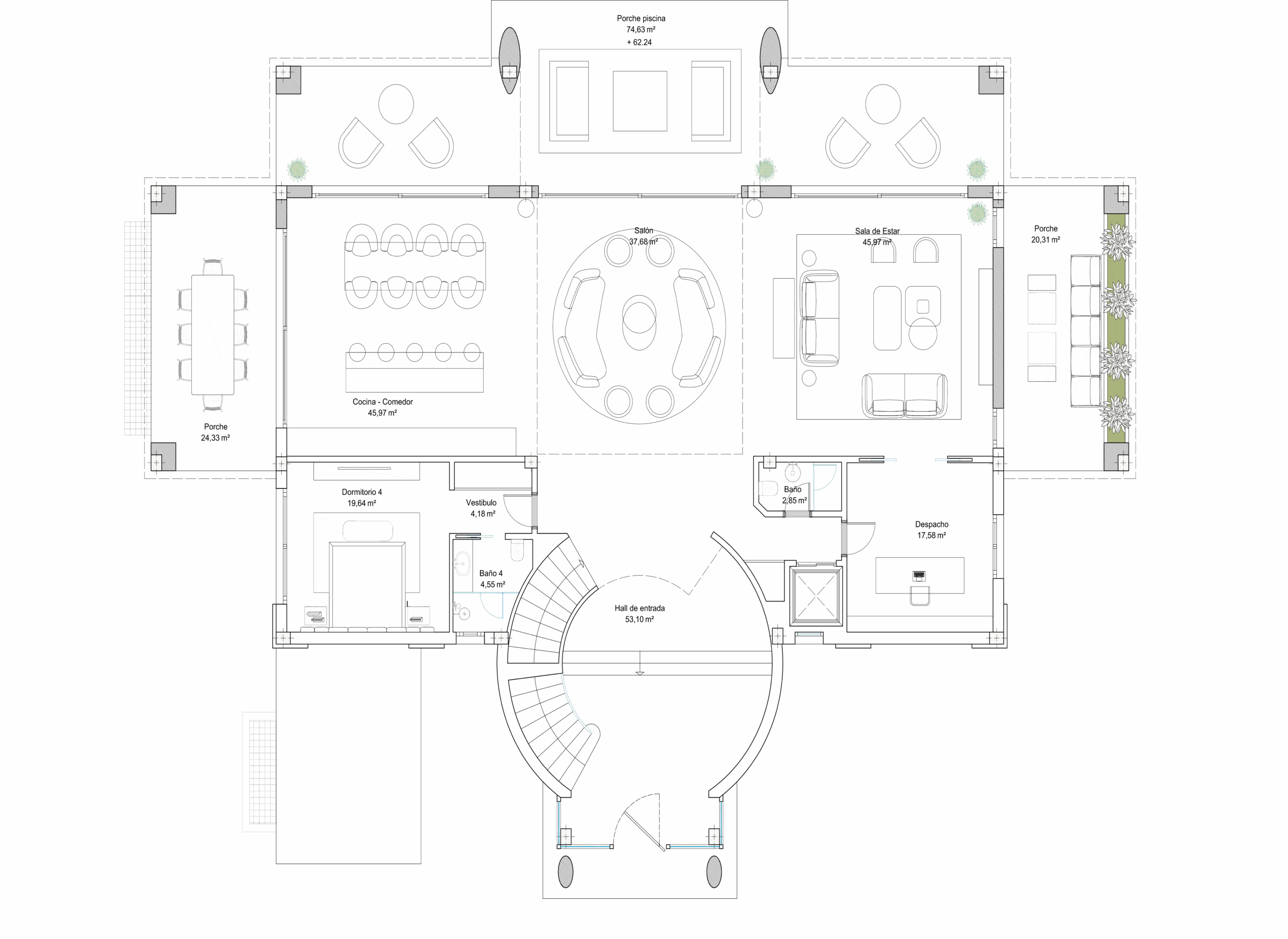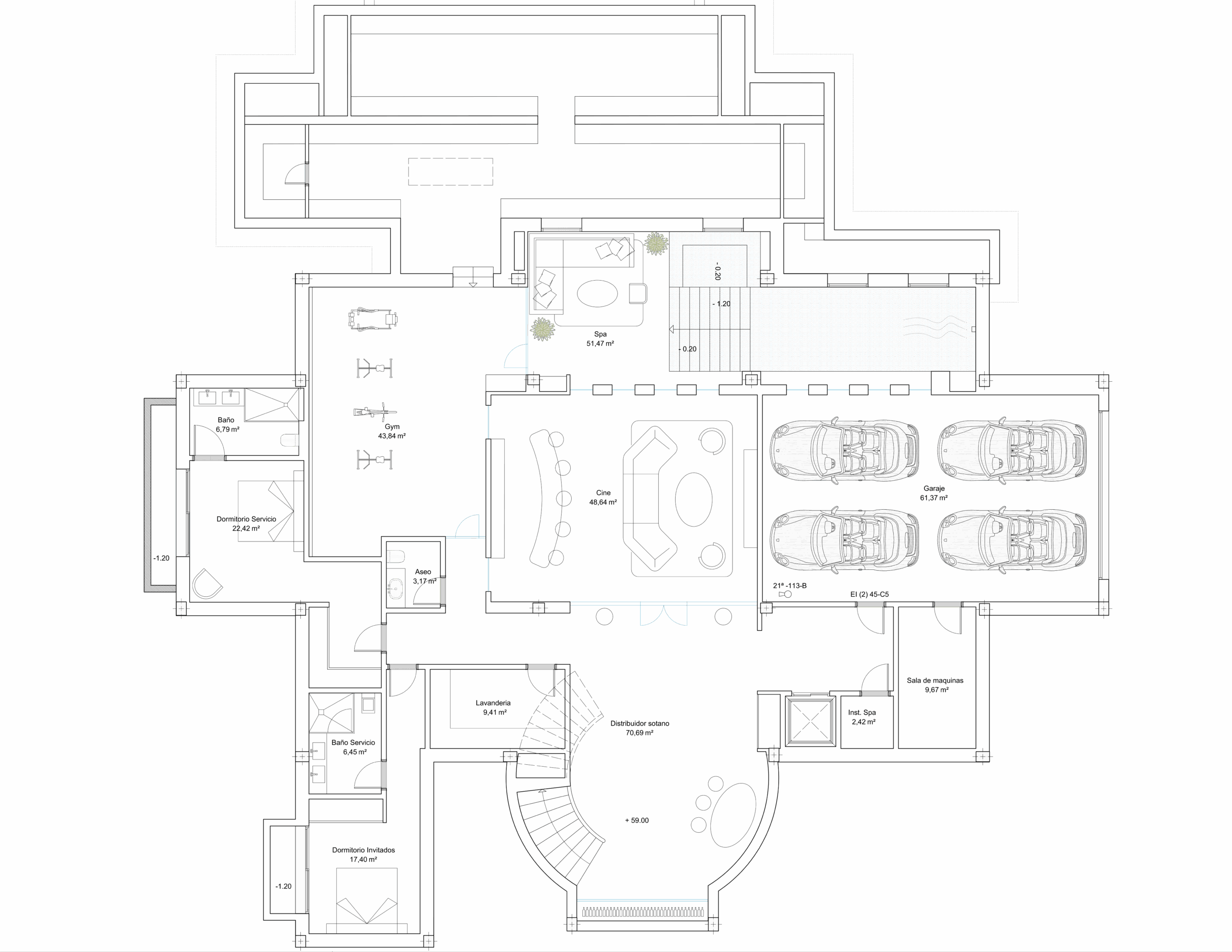On the lower level, you’ll find the entertainment and service areas, including a bar, spa with Turkish bath and sauna, gym, and an indoor heated swimming pool. This level also includes two additional bedrooms, two bathrooms, a laundry and storage area, a staff apartment, and a guest room with an English patio. A garage for two cars is also located on this floor.
