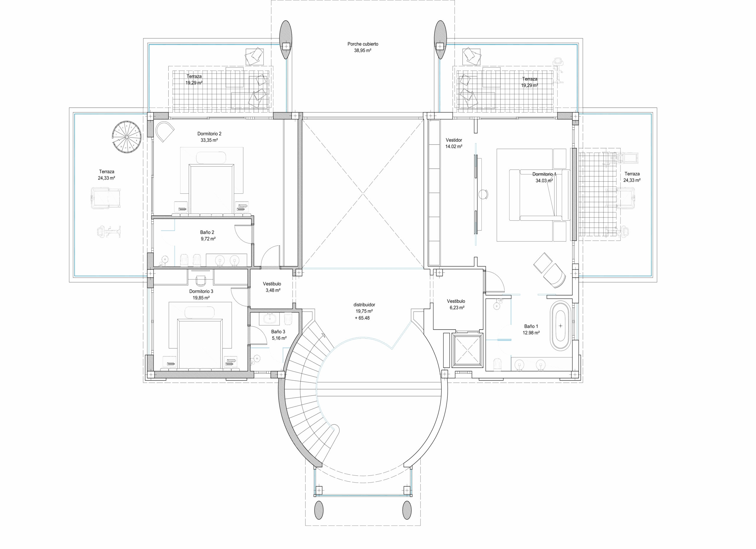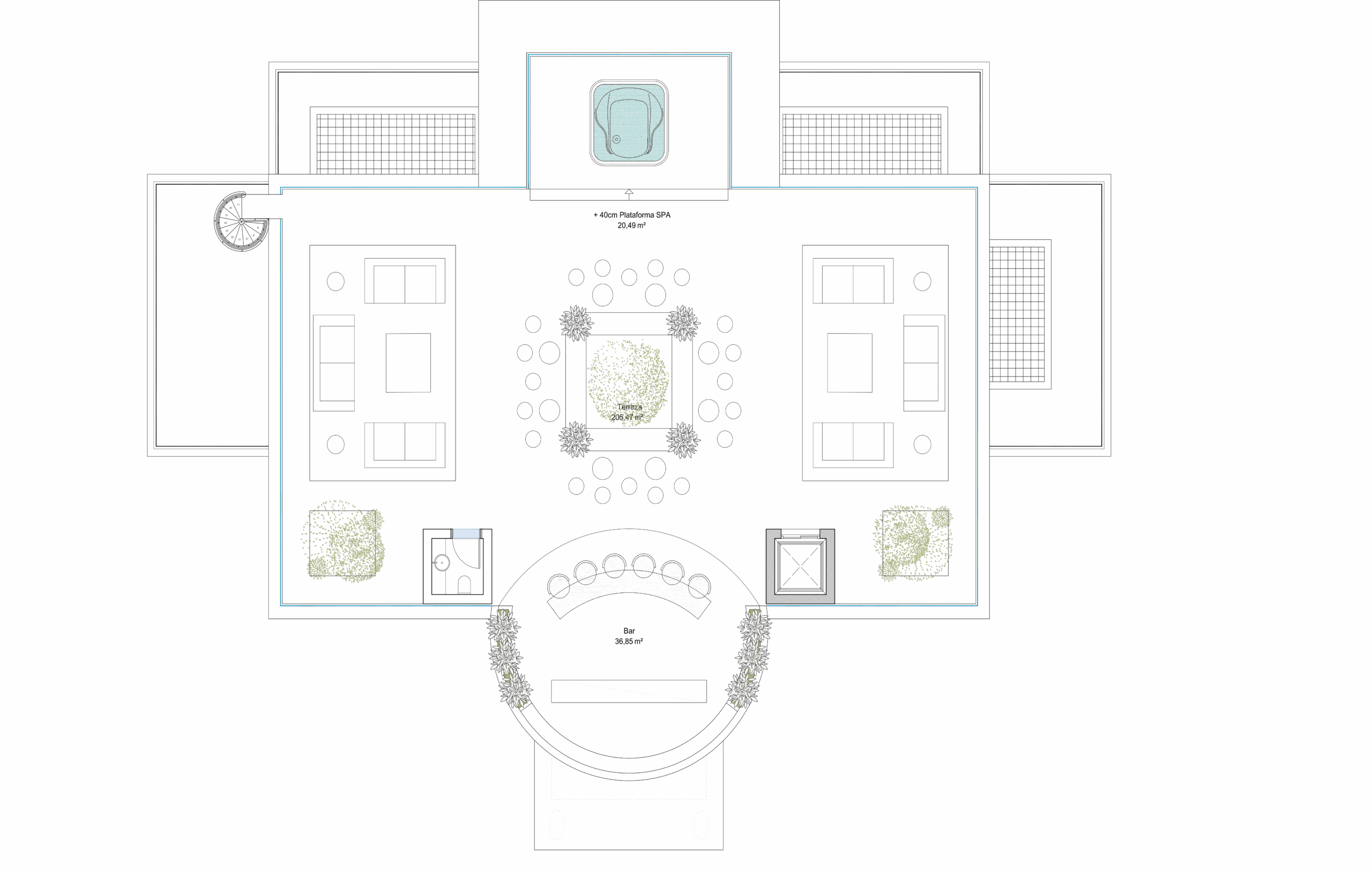 The rooftop terrace is designed for full relaxation, complete with a jacuzzi, sunbeds, chill-out areas, and an outdoor kitchen offering 360º panoramic views.